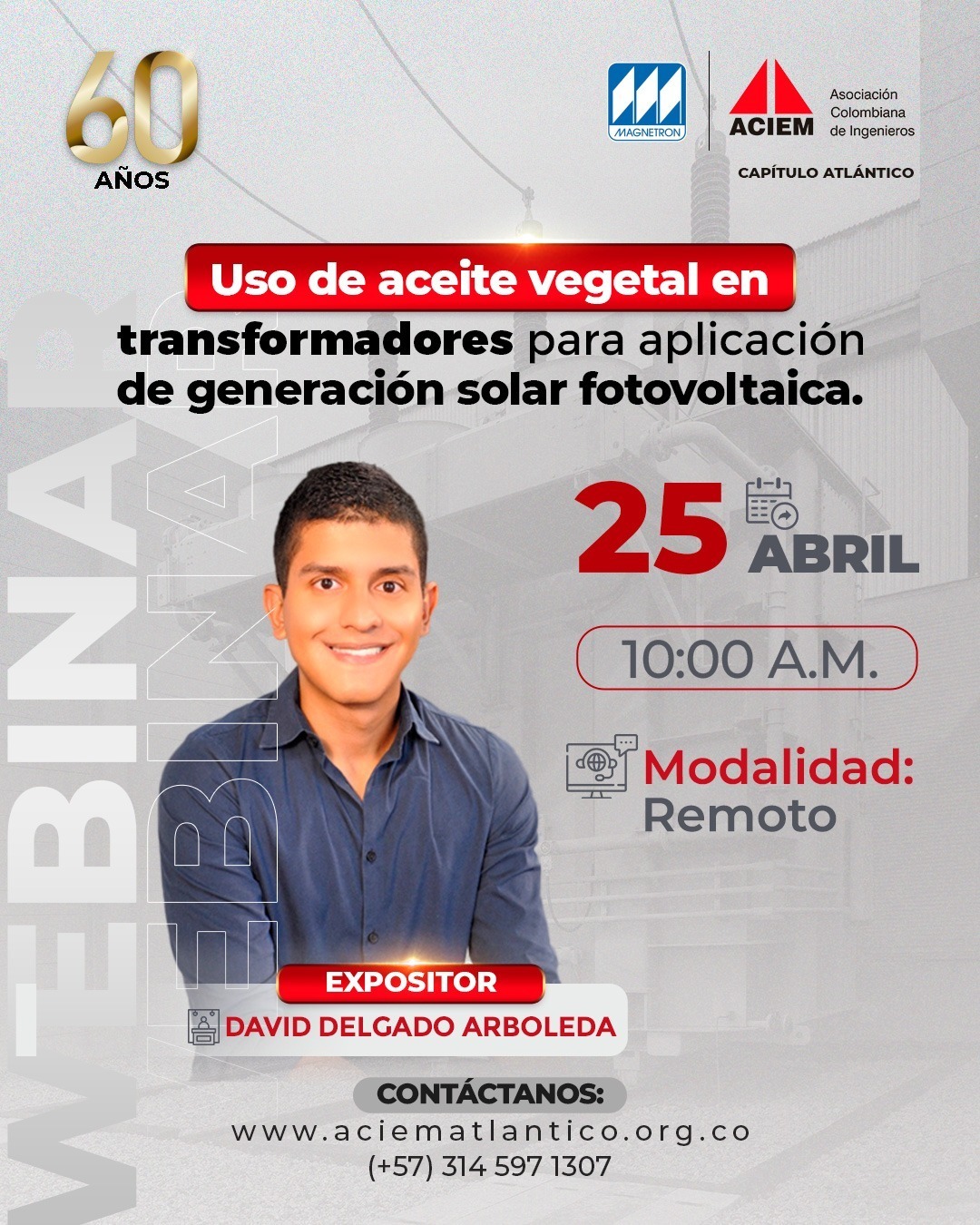 Ingeniero Electricista egresado de la Universidad del Norte, Especialista en Gestión Eficiente de la Energía, Gerencia de Proyectos MSc. en Fuentes Renovables de Energía, Administración Energética, Certified Energy Manager (CEM) de la Asociación Norteamericana de Ingenieros en Energía (AEE)